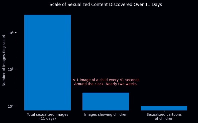 Three million sexualized images in 11 days. Twenty-three thousand of them showed children. One image of a child every 41 seconds. Around the clock. For nearly two weeks.